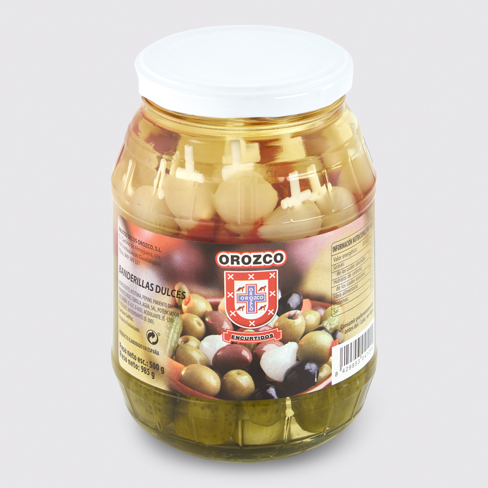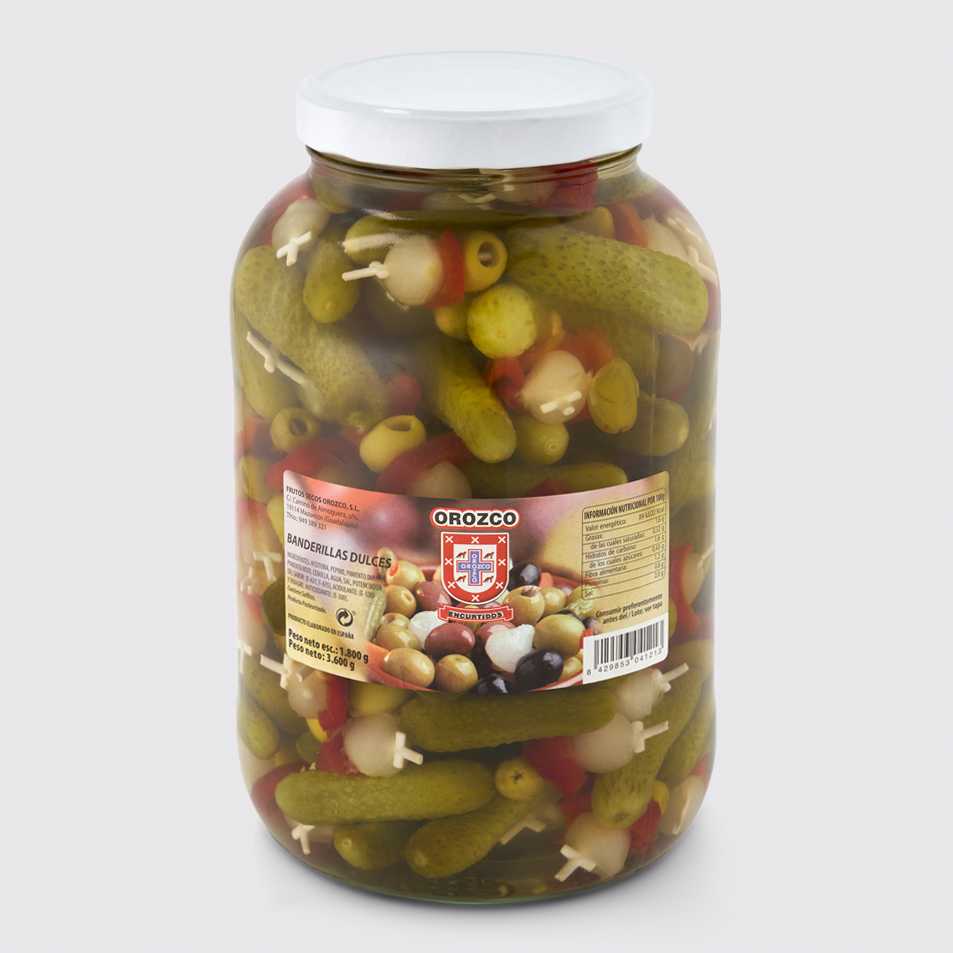 Una opción vistosa y deliciosa que alegra cualquier mesa. Nuestras banderillas dulces combinan pepinillos crujientes, aceitunas y suaves cebolletas, acompañadas de pimiento que aporta un toque delicado y equilibrado. Una mezcla irresistible que entra primero por los ojos y conquista después por su sabor.